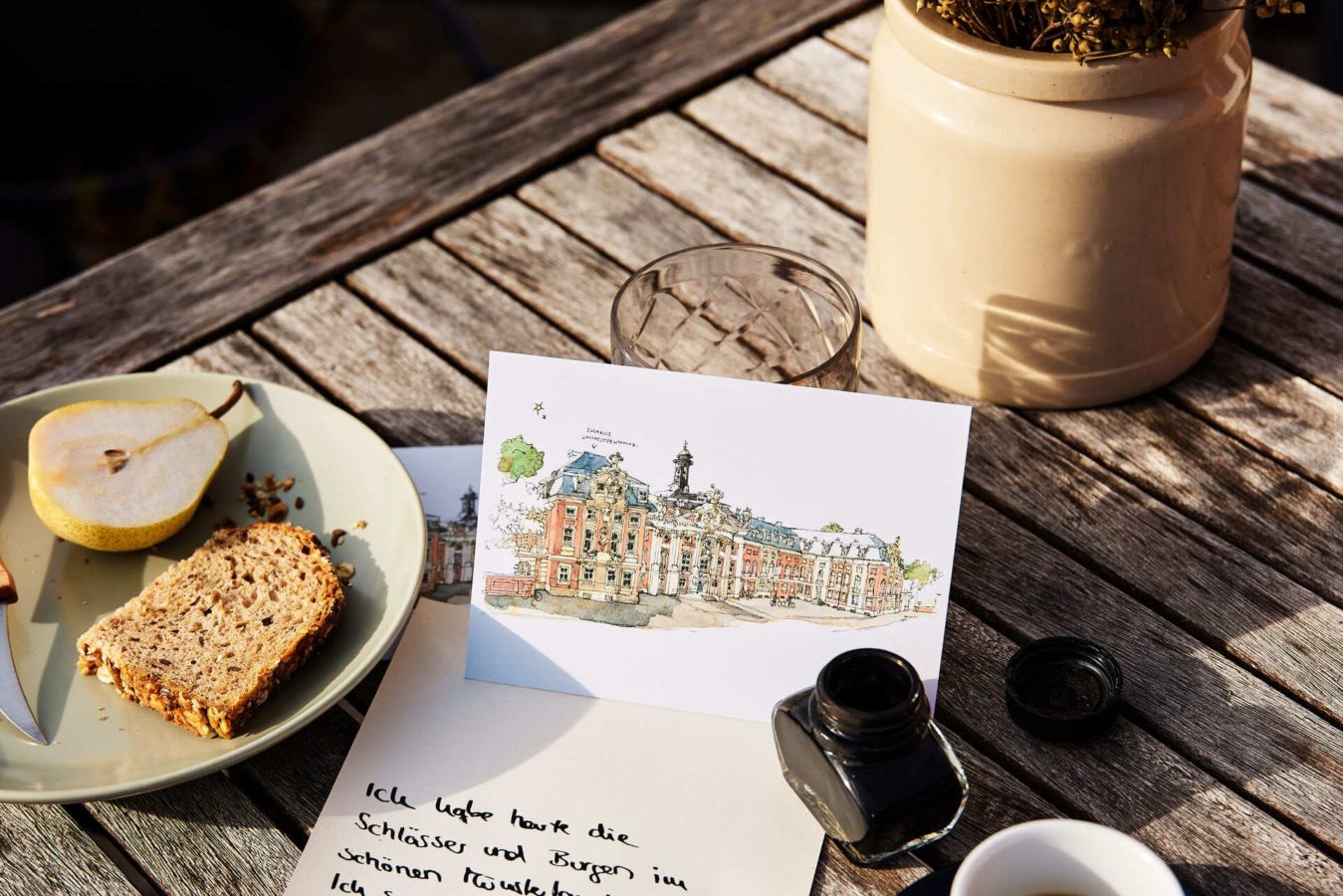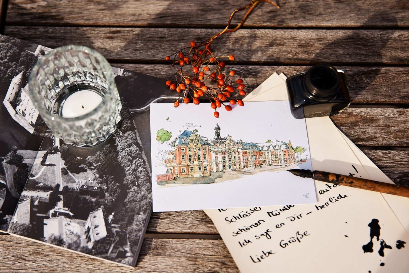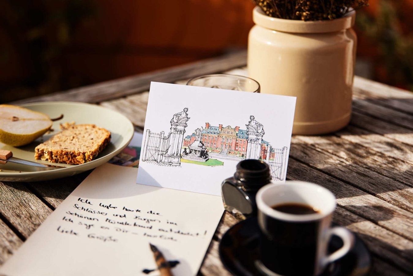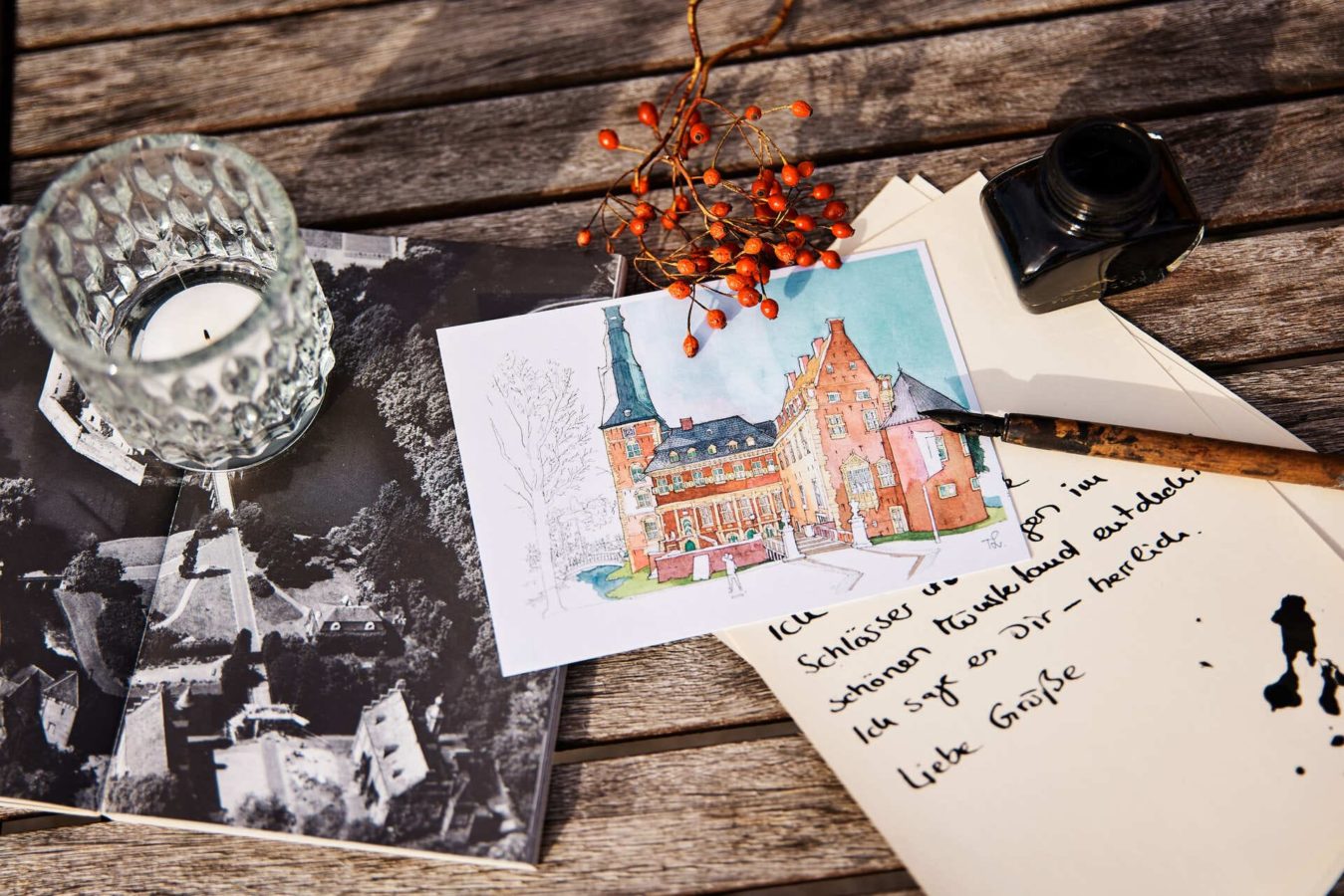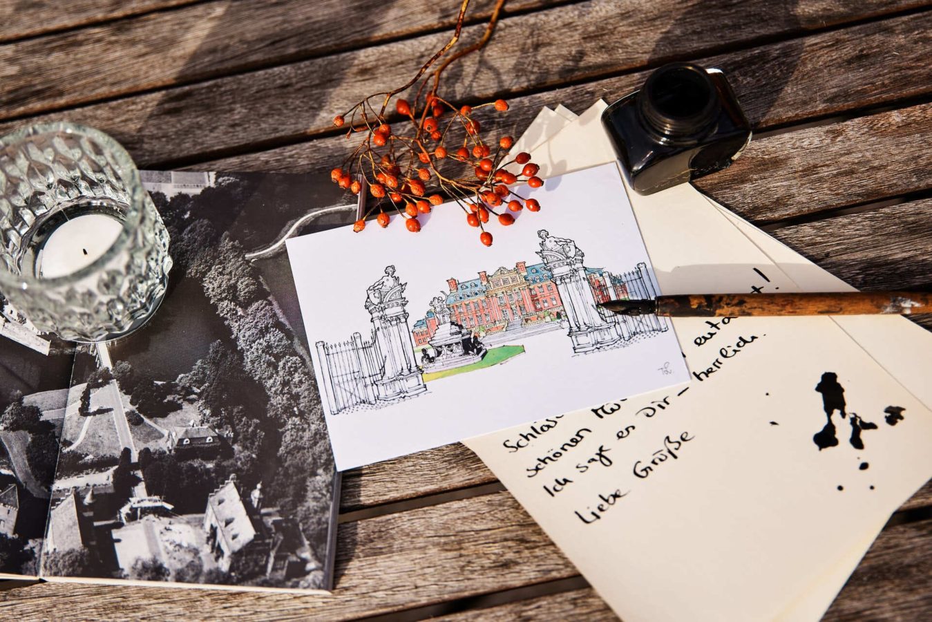 Verschick doch mal wieder eine Postkarte statt einer E-Mail oder Whatsapp-Nachricht! Denn handgeschriebene Grüße zeugen von Wertschätzung und hinterlassen etwas Bleibendes. Deine Lieben werden sich bestimmt über diese handgezeichneten und individuell kolorierten Postkarten freuen. Till Lenecke war dazu für dich unterwegs an den Schlössern und Burgen im Münsterland und hat ganz besondere Zeichnungen angefertigt. In der Region produziert, überrascht du mit dieser hochwertigen Karte ganz sicher!